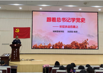 随后湖南警察公司教授、千亿球友会硕士生导师刘武阳为学员们讲授了本次培训班的第四节党课——《跟总书记学党史——长征永远在路上》。他结合案例和图解,从长征的历史背景、艰苦卓绝的长征、伟大的长征精神、走好新时代长征路四个方面对专题进行了深入讲解和阐释,使学员加深对长征和长征精神的了解,深刻理解长征的历史意义、长征精神的内涵及时代价值。刘武阳教授强调:“要坚定信念、勇于挑战、服务人民,并自觉以实际行动弘扬长征精神、传承红色基因,在全面推进中华民族伟大复兴的新长征路上顽强拼搏、奋勇前进。”