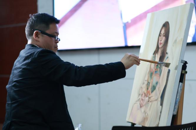 讲座中,庞茂琨教授强调艺术创作需要人的独特情感和创造力,油画是一个非常传统的纯艺术类的艺术形式,能精准呈现自然空间体积与色调,展现独特材质美感。庞教授现场以一名员工为模特,开启现场油画肖像写生环节。在写生过程中,经理黎青结合庞茂琨教授的颜色、技法等进行解读分享。