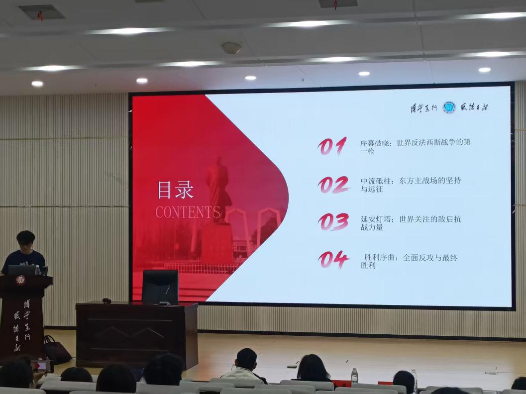 紧接着,十个小组依次登台展示,他们不仅是竞技者,更是爱国情感的传递者,各小组充分发挥专业优势,通过海报、PPT等丰富形式,生动呈现了精心打磨的创作成果。每一段讲述都饱含深情,每一幅作品都被注入青春的解读,诠释出对祖国最深情的告白。活动赢得了现场评委和同学们的阵阵掌声。